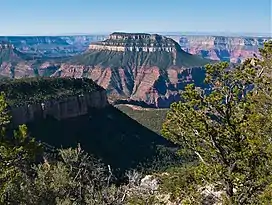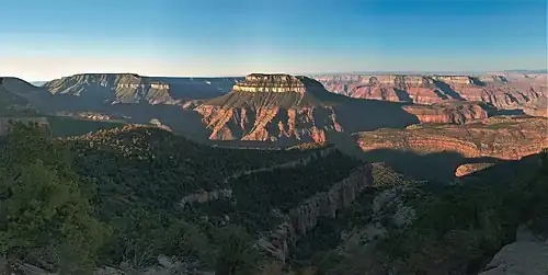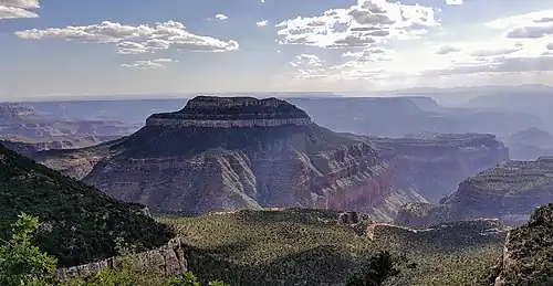 Steamboat Mountain is a 7,410-foot-elevation (2,260-meter) summit located in the Grand Canyon, in Coconino County of northern Arizona, US.[3] It is situated four miles northwest of Holy Grail Temple, and 2.5 miles west-southwest of Timp Point on the North Rim. George Wharton James described it as a "majestic butte", nearly encircled by Galloway and Saddle Canyons.[5] Topographic relief is significant as it rises over 5,400 feet (1,600 meters) above the Colorado River in three miles. According to the Köppen climate classification system, Steamboat Mountain is located in a Cold semi-arid climate zone, with precipitation runoff draining west to the Colorado River via Tapeats Creek and Stone Creek.[6] This feature's name was officially adopted in 1932 by the U.S. Board on Geographic Names.[3]