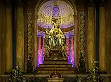 The altar stands on an elevated platform situated above a small cave associated with Elijah. The cave can be reached from the nave by descending a few steps and holds a stone altar with a small statue of Prophet Elijah. The altar above the cave is dominated by a statue of the Virgin Mary carrying Jesus in her lap and holding the Scapular in her right hand, known as Our Lady of the Scapular. The Blessed Virgin Mary is the patroness of the Carmelites, and as such is known as "Our Lady of Mount Carmel".