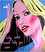 Vine has made a number of large paintings of Kate Moss including Holy water cannot help you now (2005) and Kate unfinished (2005). Some of Vine's paintings of the supermodel were painted during the media scandal regarding Moss' alleged cocaine use. One painting of Moss exhibited at Hiscox Art Projects in London, had a slogan Must be the season of the witch across it in red paint.[51] Vine compared the supermodel to the Mona Lisa and said: "There's a bravery in Kate's eyes."[52] Vine herself admitted to a four-month cocaine addiction.[53] She said, "I had been painting Kate Moss for a long time, both before the time of her crisis and during it. I felt very strongly for her—she's a hard-working mum and it seemed as if suddenly the world turned against her."[48] Vine said the media should not have accused Moss of being a bad mother, commenting that "men can go off and take as many drugs as they want, have as many children as they want, and their parenting rarely comes into question".[52] A Vine painting of Kate Moss was bought by fashion designer, Alexander McQueen.[54]