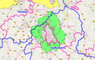 The Stoke-on-Trent Green Belt is a green belt environmental and planning policy that regulates the rural space throughout mainly the West Midlands region of England. It is contained within the counties of Cheshire and Staffordshire. Essentially, the function of the designated area is to prevent surrounding towns and villages within the Stoke-on-Trent conurbation from further convergence.[1] It is managed by local planning authorities on guidance from central government.