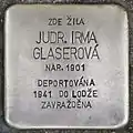 Dr. jur. Irma Glaserová b. Schwarzová was born on 2 August 1901 in Žatec. Her parents were Sigmund Schwarz and Kamila b. Töpferová. She studied law and married Ařnost Glaser. The couple had at least two daughters, Eva (born 1925) and Alexandra (born 1930). Together with her husband and daughters, Irma Glaserová was deported with transport B to the Łódź Ghetto In 1941. Their transport numbers were 468, 469 and 471 from 1,003. There, Irma Glaserová, her husband and their younger daughter were murdered by the Nazi regime.[12][13]