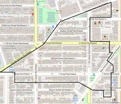 The Strivers' Section Historic District is in the north end of Dupont Circle, a historic district and neighborhood in the northwest quadrant of Washington, D.C. The boundaries of the historic district are roughly Swann Street and the Dupont Circle Historic District on the south, Florida Avenue and the Washington Heights Historic District on the north and west, and the Sixteenth Street Historic District on the east. In addition to Florida Avenue, major roads that pass through the district are 17th Street, 18th Street, New Hampshire Avenue, and U Street.[2][3]