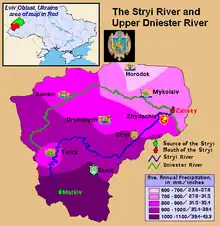 The Stryi (Ukrainian: Стрий) is a river in western Ukraine. It starts in the Carpathian mountains and snakes through the mountains running for 231 kilometres (144 mi). After 193 kilometres (120 mi) it passes Stryi. The river continues for another 32 kilometres (20 mi) before joining the Dniester near Khodoriv.