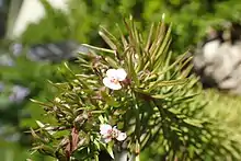 This species is leafy-stemmed and scrambling, growing up to 10 cm tall with leaves that are 3 cm long and 5 mm wide. It blooms in late winter and spring with small (3–4 mm wide) white flowers that bear red stripes.[3] S. adnatum is primarily found in jarrah and karri forests, among reeds of paperbark swamps, and in heath by streams entering the ocean.[4] S. adnatum is also commonly found in the wild, growing along cleared firebreaks in the Porongurup ranges, indicating that it is tolerant to ground disturbance. It has been cultivated by members of the W.A. Wildflower Society (a not-for-profit group) in Landsdale,[5] where it can be purchased by the public. It is easily propagated by cuttings and is robust in culture, although it can suffer from sucking insects such as scale. It has been found to grow well as an indoor potted plant near a well-lit window with indirect or partial sun. Taken together, these two pieces of information indicate that it would make a good commercial houseplant, possibly capturing the sector of the market fascinated by touch-stimulated plants such as venus fly traps or mimosa.
