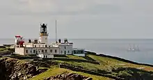 The lighthouse was built by Robert Stevenson in 1821 and is the oldest lighthouse in Shetland.[1] From 1906 until 1987, there was also an active foghorn,[2] which is traversable in azimuth. This replaced a fog bell which had been presented after the loss of the Royal Victoria in 1864. The bell now hangs in the parish church at Dunrossness.[2] The light was automated in 1991 and the keepers' houses were converted into holiday accommodation. The foghorn was restored in 2015 and sounds on special occasions. The lighthouse complex also has offices for the RSPB who look after the bird reserve which surrounds the lighthouse.