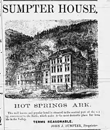 John J. Sumpter's father, James Sumpter, was an early settler of Hot Springs, Arkansas and in 1844 purchased the land that the Sumpter House was built upon.[5][7] James Sumpter was a sufferer of rheumatism and dyspepsia and when all of the remedies of his home physicians in Missouri failed, he, his wife Elizabeth and two sons, John and William, moved from Missouri to Hot Springs, Arkansas, a place then known for being a health resort.[7]