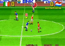 Super Sidekicks 3: The Next Glory was co-headed by director H. Kawano and producer Eikichi Kawasaki, who was involved in the two previous Super Sidekicks entries.[5] A member under the pseudonym "Uzumasa Seven" worked as main programmer, with "Kanimaro" and "Perfomaru" acting as designers.[5] Shinsekai Gakkyoku Zatsugidan members Akihiro "Ackey" Uchida and Pearl Shibakichi handled the sound design.[5][6] Other members collaborated in its development.[5] Super Sidekicks 3 was first released by SNK for the Neo Geo MVS in Japan on March 6, 1995, and North America in April, and later for Neo Geo AES on April 7.[7][8][9] It was also showcased by SNK during the 1995 ACME show.[10] The game was later re-released for the Neo Geo CD in Japan on June 23, 1995 and North America in October 1996.[7][9][11] In 2008, it was included as part of SNK Arcade Classics Vol. 1 for Wii, PlayStation 2 and PlayStation Portable.[12] In 2013, it was also included as part of the Volume 2 game card for Neo Geo X.[13] Hamster Corporation re-released the title for Nintendo Switch, PlayStation 4 and Xbox One in June 2018 under their Arcade Archives series.[14]