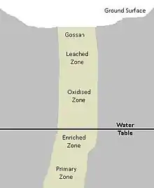 Distinct zones of supergene processes can be identified at various depths. From the surface down they are the gossan cap, leached zone, oxidized zone, water table, enriched zone (supergene enriched zone) and primary zone (hypogene zone).[3]