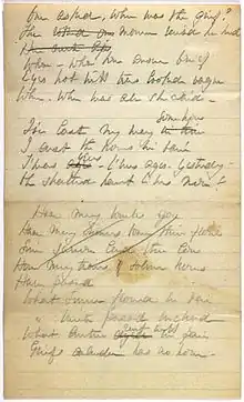 - ↑ Dickinson, Emily. “No Words ripple like Sister's”. H B134. JL 913. OMC 247. 1880s. pencil. watermark/embossment: T, Weston's Linen 1876. 20 x 13 cm. folded in thirds. FF 243. Pinholes, paste marks. Dickinson Papers. Harvard University.