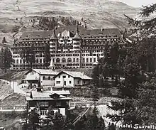 The history of Suvretta House dates back to the beginning of the 20th century when an English shipbuilder had the "Villa Suvretta" built for his wife by Swiss architect Karl Koller. However, his wife didn't like the villa, and he sold it to his friend, Charles Sydney Goldman, British Member of Parliament and businessman who had made a fortune trading in diamonds.[3] Goldman admired the house and gradually bought 4.5 hectares of surrounding land. Goldman met Swiss hotelier Anton Bon, and both agreed on building a new hotel. The groundbreaking ceremony took place on 22 April 1911.[4] According to the hotel, the cornerstone was laid on April 22, 1911, with the hotel erected over the next year and a half. It was inaugurated on December 16, 1912,[5] with 200 invited guests. The interior had been created in 1912.
