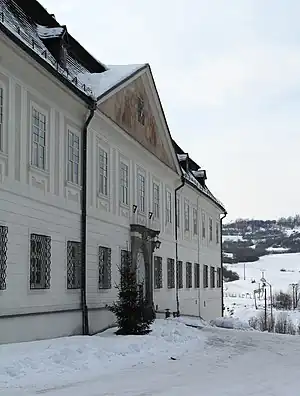 A chapel richly decorated with frescoes of a late-baroque illusionist space with a free view emerges from the southern tract of the mansion. It is dedicated to the Assumption of the Virgin Mary.[2] The chapel is also highlighted on the outside on the facade, which ends with a fresco connecting the church theme with the motif of the image of the donor.