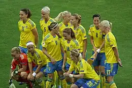 In the final round, Sweden met Denmark in the first game and both drew 1-1. Also against qualifying opponents Finland it was enough only to a draw, this time without goals. Thus, Sweden was only in third place before the last game against hosts England and needed a victory to progress.[6] This secured Anna Sjöström through the only goal of the game in the third minute and as the Finns surprisingly won against Denmark in the parallel match, Sweden was even group winner. In the semi-final against Norway, it was dramatic, because twice Hanna Ljungberg could compensate for a Norwegian lead, with one last minute before the end of the game. This was followed by an extra-time, in which Solveig Gulbrandsen secured the final for Norway with her second goal. There, the Norwegians lost but once again against Germany. With three goals, Hanna Ljungberg, together with three other players, was the second best scorer in the tournament.