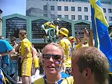 Sweden played their opening match on 11 June against Ukraine. Zlatan Ibrahimović scored from close range after a pass from Kim Källström in the 52nd minute. Andriy Shevchenko equalised by heading in a corner just three minutes later, and in the 62nd minute, he scored another header. Sweden were unable to respond to this and lost the match 1–2.[7] Sweden played their second group stage match against England on 15 June. Andy Carroll scored 1–0 for England with a powerful header in the 23rd minute. Sweden equalised through an own goal by Glen Johnson and took the lead when Olof Mellberg scored 2–1 in the 59th minute. However, England turned the game around with goals by Theo Walcott and Danny Welbeck. The two losses meant that Sweden were already eliminated from the next stage.[8] In the third group stage game on 19 June, Sweden played against France. Zlatan Ibrahimović scored a spectacular flying volley early in the second half and Sebastian Larsson sealed a meaningless 2–0 win during stoppage time. After Sweden's early exit from the tournament, the veteran Olof Mellberg announced his retirement from the national team.