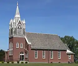 The church was built in 1910.[3] It is a one-story brick church with a steep gable roof, brackets under the overhanging roof, arched windows and steeple in the front. Several of the stained glass windows depict Biblical scenes. The structure displays a modified Late Victorian Gothic Style. There is a second-floor balcony in the entry steeple to view church services from above. There is also a fully finished basement for small gatherings.[4]