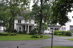 The main house was built about 1898 by George and Isabel Valle Austen on land that had been previously owned by Horatio Jones and the Wadsworth family. It was then the home of Winthrop and Margaret Ward Terry Chanler. It is a 2+12-story frame building with clapboard siding and a hipped roof with dormers. It is in a "U" shape and features a grand Tuscan colonnade. Also on the property are contributing gate posts, a stable, fountain, two tenant houses, and the Chapel of St. Felicitas. The chapel was built in 1913 and is a small stucco building with a slate roof and stained glass windows.[2] The structure was later moved to the neighboring home near Fall Brook. The main house (with ten acres) was sold in 2004 and operated as a bed and breakfast, wedding venue, spa and yoga studio until 2014. Currently Sweet Briar is a private residence.