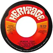 On October 3, 1969, a new version of the song was produced by Ross, who hired studio musicians to record the instrumentation, to which Bill Deal and the Rhondels laid down the vocals.[4][5] This version had a more upbeat tempo and ran for only 2:18. It was released as a 7" single under the Heritage label (HE818) in November 1969. The record had "Swingin’ Tight" on the A-side and "Tuck’s Theme" on the B side.
