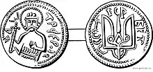 The first information on the emblems of Rus knyazes comes from the middle of the 10th century. Ebn Meskavayh, in his description of the Rus’ campaign against Barda in 943–944, noted that the Rus’, when taking ransom for prisoners, left their symbol in the form of a piece of clay with a seal, so that the former prisoner would be handled no more. What sort of symbol was depicted on the seal is unknown; it is possible that it might have been the coat of arms of Igor of Kiev, who reigned in those years. It is also unknown whether these Rus’ belonged to the army of Igor, since ancient Rus’ chronicles are silent regarding the campaign against Barda. Further information on such types of stamps is found in the Primary Chronicle, which discusses the campaign of Olga of Kiev in the north: “In the summer of 6455 [947 C.E.] Olga went to Novgorod and established over the Msta pogosts and tribute, and over the Luga dues and tribute; and her hunting grounds were over all lands and signs and places and pogosts.”[4] The word “signs” here refers to the symbols marking the knyaz's property. Russkaya Pravda testifies that this word means an item marked with the knyaz's symbol. In Russkaya Pravda there are also other references to the sphere of the knyaz's emblems: “But for the knyaz’s horse, which has a mark, 3 grivĭnas.”[5] Undoubtedly, by the word “mark” one is to understand “the knyaz’s brand (stamp)”. Written sources, however, do not give a description of the knyazes’ emblems.[6] Depictions of the “coats of arms” of Rus’ knyazes are known to us by surviving coins and seals of the time.