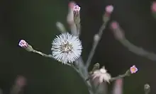 Southwestern annual saltmarsh aster usually flowers from July through November, but sometimes into January. It has white, sometimes pink, ray florets surrounding yellow disk florets. As the plant is drying after pollination, each ray floret curls into 1 to 2 coils.[5]