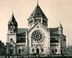 The synagogue was built in pink and grey Vosges sandstone from the Phalsbourg quarries and crowned with a 54 m (177 ft) dome,[3] which rivalled the neighbouring Saint-Pierre-le-Jeune Catholic Church. The main hall's nave was 46 m (151 ft) long and 19 m (62 ft) wide and had 1,639 seats on two levels: 825 for the men and 654 for the women; the space surrounding the ark contained 40 seats for the choir. A lateral oratory that was used on working days could accommodate 100 people.[4] The main prayer room was equipped with a pipe organ made by Walcker Orgelbau, which was replaced in 1925 by an instrument by Edmond Alexandre Roethinger.[5]