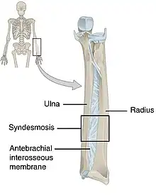 A syndesmosis (“fastened with a band”) is a type of fibrous joint in which two parallel bones are united to each other by fibrous connective tissue. The gap between the bones may be narrow, with the bones joined by ligaments, or the gap may be wide and filled in by a broad sheet of connective tissue called an interosseous membrane.[1] The syndesmoses found in the forearm and leg serve to unite parallel bones and prevent their separation.
