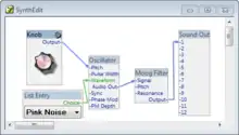 ![]() A screenshot of version 1.1 of SynthEdit, showing its node-based editor. | |