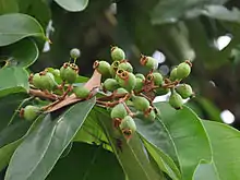 Syzygium grande or sea apple is a tall tree that can reach 30 m. The trees can be found along the coastal line of Southeast Asia. Its leaves are large with dark green color. The flowers are white and compact in clusters with strong scent. Fruits are oblong in shape and green.