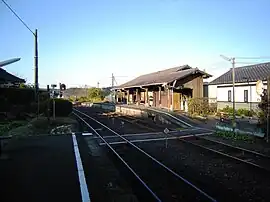 The station has two opposing side platforms, connected to an old wooden station building by a level crossing. The station is staffed. The station building, which was built in 1940, was designated a Registered Tangible Cultural Property in 2011.[1]