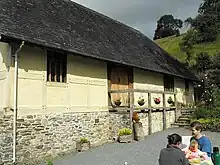 The limewashed box-framed house, four bays long, sits on a stone platform built into the hillside, under a broad half-hipped roof (now replaced with tiles rather than slates, for which evidence was found in the archaeological excavations thatch). The principal timbers are tree-ring dated to 1460: dendrochronology has also provided dates of 1594, when a first floor was inserted within the hall, and 1631 when the internal timber-framed smoke-hood was added.[4] The restoration has retained the smoke-hood, but has otherwise restored the three-unit plan of storeyed units at either end of the open, aisled hall.[8] The two trusses within the hall are a single pair of chamfered wooden speres or posts set in the floor and forming a box-frame which carries the roof, and a pair of arch-braced base-crucks with two tiers of cusped struts above the tie-beam, which spanned the whole width of 7.5 m. The analogies are with the partly aisled halls of important houses in north-east Wales and north-west England.[9] Gable and partition trusses, also aisled. Wind-braces were employed both below the wall-plate and along the purlins