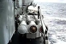Four ships – Bouvet, Kersaint, Dupetit-Thouars and Du Chayla – were modernised as anti-aircraft guided missile destroyers in 1962–1965. They were given one Tartar missile launcher, retained their three twin turrets of 57 mm guns. They were also given one Model 1972 sextuple 375 mm (15 in) anti-submarine mortar.[4] The missile launcher replaced the aft 127 mm turrets and a raised deckhouse was installed between the aft 57 mm guns where SPG-51 tracker-illuminators were situated. The Model 1972 mortar replaced the forward 127 mm turret and the fire control director for the main armament was removed. The DRBC 31 radar was moved to the fire control director's former spot atop the bridge and the DRBV 11 radar was replaced by an SPS-39A 3D model, later upgraded to the B model.[1] The complement was reduced to 278, comprising 17 officers and 261 ratings.[5]