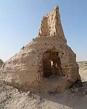 At the center of the site lies the foundation of a large temple building, north of which is the main pagoda standing 14.5 metres (48 ft) tall. The adobe structure is covered by white lime and is of the shape of an overturned bowl. North of the main pagoda are the remains of 11 smaller ones.[1][2] Most of the extant ruins date from the Western Xia dynasty, including all of the pagodas.[1][2]