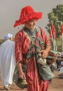 Traditionally, the garrab wears a red djellaba, and a matching large ornate hat. He carries a goatskin bag (Arabic: قِرْبَة qirba or girba) with cold fresh water, and brass cups to serve water.[1] They usually carry a bell, and have a distinct call, invoking religious themes or the good properties of the water, to attract the attention of passers-by.[3]