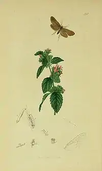 The caterpillars feed on lichen from the genus Parmelia, but they may also[1] eat plant remains. They live in a protective casing made of grass or bark that is usually attached to a tree. The females remain in this casing when adult. The males' flight time ranges from May to June.