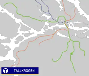 Tallkrogen subway station is on the green line of the Stockholm metro, located in Tallkrogen, Söderort. The station was inaugurated on 1 October 1950 as part of the inaugural stretch of Stockholm metro between Slussen and Hökarängen.[2] The distance to Slussen is 6 km (3.7 mi).