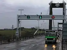 The bridge is owned and maintained by the Tamar Bridge and Torpoint Ferry Joint Committee, a conglomerate between Plymouth City Council and Cornwall County Council.[1] It has a main span of three lanes, which use a tidal flow arrangement to maximise traffic flow at rush hour, and two outer lanes. The north of these is used as a local access route from Saltash, while the south is used by cyclists and pedestrians but could be converted to meet future vehicle demand if alternatives for pedestrians and bicycles were provided, a dedicated ferry, shuttle bus, cable car or bridge have been considered.[1] The bridge capacity is around 1,800 vehicles per hour per lane over each main and added decks:[5]