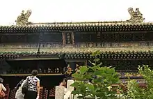 The Mahavira Hall has double-eave hip roofs (重檐庑殿顶) covered with yellow glazed titles, which symbolize a high level in Chinese architecture. Under the eaves is a plaque with the words "Fuhai Zhulun" (福海珠轮; Fuhai means the western paradise and Zhulun means a big ship.) written by Qianlong Emperor (1736-1795) in the Qing dynasty (1644-1911). On each end of the main ridge is a giant glazed Chiwen with colorful glaze and vivid style. It was made in the Yuan dynasty (1279-1368). Chiwen is a legendary animal with a dragon head and fish tail. In the ancient time, people placed Chiwen at both ends of houses' main ridges to prevent water leakage, avoid fire and protect their family. It was said that when Kangxi Emperor (1662-1722) once came to Tanzhe Temple, he saw the Chiwen was going to leave, he ordered to build a long gilded chain and plug a sword to lock and prevent it from escaping.[1]