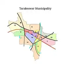 At present the area of the town is 3.88 square kilometres (1.50 sq mi). The Tarakeswar Municipality area is divided into 15 wards for administrative purposes. Tarakeswar town is situated in the center of Tarakeswar Block. Four Gram Panchayats surround this Municipality. North portion of this town is Bhanjipur Gram Panchayat, south portion is Ramnagar Gram Panchayat, east portion is Baligori (1) Gram Panchayat and west portion is Santoshpur Gram Panchayat.[9]