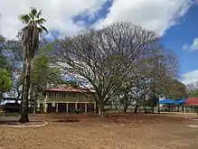 The school celebrated the 75th jubilee of its official opening on 2 April 1955, with approximately 1300 people in attendance. A photograph taken on the day shows the Ferguson teaching building with an open front verandah, balustrade with horizontal rails and paling fence. The visitors' book was signed under the Leopard tree (Caesalpinia ferrea) believed to have been planted c.1894 by then Head Teacher, Edward Doran, and "Johnny Tarampa, King of the Trampah tribe" who died c.1901.[33] Other mature trees grow on the site, such as Jacaranda (Jacaranda mimosifolia), Eucalyptus spp, and a large Fig Tree (Ficus sp) in the garden of the teacher's residence.[1]