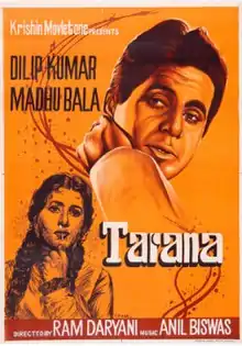 Tarana (transl.Anthem)[lower-alpha 1] is a 1951 Indian Hindi-language romantic comedy film produced and written by K. S. Daryani and directed by Ram Daryani. Starring Madhubala and Dilip Kumar together for the first time, Tarana revolves around the titular character (Madhubala), a free-spirited village girl who falls in love with a visiting doctor (Kumar).
