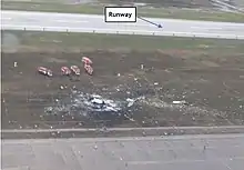 While on final approach to Kazan International Airport, the crew initiated a go-around due to an unstable approach but crashed onto the runway in a 75-degree-nose-down attitude, at a speed of 242 knots (448 km/h; 278 mph) moments later and exploded upon impact with the ground.[5] A second explosion occurred 40 seconds after impact. One of the airport's surveillance cameras caught the crash on video. All 44 passengers and 6 crew members were killed; there were no casualties on the ground. High winds and cloudy conditions were reported at the airport at the time of the crash.[6][7]