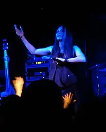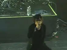 Tatsuro described his voice as "atypical", which makes it stand out and easy to recognize.[5] Although he has taken vocal lessons in the past, he stopped as he did not understand the "abstract" things the instructor would say. "The best teacher I have now is my experience in the field. With trials and errors I have come to understand the fundamentals of singing such as breathing, posture, placement of voice, endurance and so on."[5] When an interviewer suggested a singer must be thinking about the lyrics while performing, Tatsuro dismissed the notion and stated that singing was like riding a bicycle.[7] He also said that he prefers to sing, and does not like screaming because it is tiring.[39] Like the other members of Mucc, Tatsuro often performs barefoot.[40] He said he got the idea after seeing Cocco's April 20, 2001 performance on Music Station, where the barefooted singer abruptly left the studio after finishing her song.[39] He further explained that this was in Mucc's indie days when they had no money; whenever they were putting together new costumes, the shoes were typically the most expensive part, but as a visual kei band they could not simply wear sneakers.[39] Nightmare vocalist Yomi said that he performed barefoot when he was an indie artist due to Tatsuro's influence.[39]