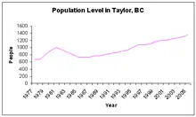 Major industrial development began in 1957, when Westcoast Energy (later Duke Energy) built the province's first gas processing plant, as well as a refinery and pipeline to Kamloops.[5] The community that formed around this industrial development was incorporated as a village on August 23, 1958 and soon after Canfor opened a planer mill. Meanwhile, 120 km (75 mi) upstream, the W.A.C. Bennett Dam was completed in 1966 and the Peace Canyon Dam in 1980, which controlled the level and flow of the Peace River, making navigation and flood control much easier. The 1961 Canadian census, the first to recognize Taylor as a census subdivision, counted 438 people.[6] During the subsequent five years the population rose 36% to 595 people but rose only a further 2% to 605 people by 1971.[6]