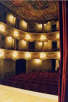 The nucleus for the theater was formed by a Società del Teatro, founded in 1780, and composed of ten condomini (owners) in the town. They utilized this space in the town palace to build this theater with a frescoed wooden roof, above ground seating and two floors of theater boxes. The decoration is an elaborate rococo décor on wood, with wooden columns painted as faux marble. The theater presently sits about 100 persons. In the twentieth century, for years the theater was abandoned and threatened with destruction. In 1985 it was designated as a historic national treasure and recently subsequently restored.[1]