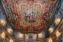 The painted decoration was completed Antonio Liozzi, who painted the central ceiling fresco of the goddess Flora, as well as the mouldings and frames.[2] 43°03′24.7″N 13°25′31.0″E / 43.056861°N 13.425278°E / 43.056861; 13.425278