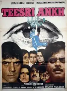 Teesri Ankh (transl.The Third Eye) is a 1982 Hindi-language action thriller film directed by Subodh Mukherji[2] and produced by Subir Mukherjee. It features an ensemble cast of Dharmendra, Shatrughan Sinha, Rakesh Roshan, Zeenat Aman, Neetu Singh, Sarika, Amjad Khan and Nirupa Roy. The film was delayed for 5 years. Eventually the film