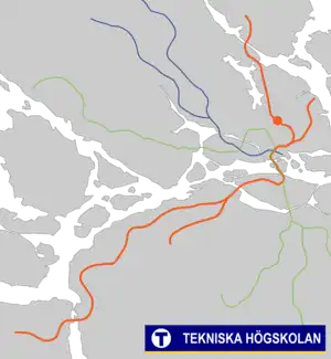 Tekniska högskolan is a station on the red line of the Stockholm metro, located in the districts Östermalm and Norra Djurgården, near the Royal Institute of Technology (Kungliga Tekniska högskolan). The station was opened on 30 September 1973 as the northern terminus of the extension from Östermalmstorg. On 12 January 1975, the line was extended further north to Universitetet.[2] Tekniska högskolan metro station is connected to Stockholm East Station or Stockholms östra, a station on the Roslagsbanan railway, and a terminal for buses towards Norrtälje and Vaxholm.