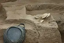 Numerous artefacts were recovered from the burnt buildings; they include pottery and stone vessels, figurines, and all sorts of tools. There were also many storehouses.[1]