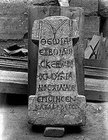 The Altar to Iarhibol was found at the entrance of the Temple of Bel by the Yale-French excavation team in the years of 1928-1929. The inscription on this Altar was inscribed in Greek by a Roman Commander, Skeibonios Moukianos, which reads: "To the god Iarhibol. Skeibonios Moukianos, the tribune, made this on command (of the god)." However, literal translations of the Greek suggest that Skeibonios is a misspelling for the Latin name Scribonius and that the transcription for Moukianos reads as Mucianus based on the evidence from the military parchments found from the excavation site.[5] The inscription on the altar tells that a Latin-named Commander of a Roman army wrote his inscription to Iarhibol in Greek. Scribonius Moucianus, a Greek descendant who held a position of power in a Roman army. The inscription likely dates to around 165–256 CE. However, another translation offered for the text on the altar is as follows: "[For] the god Iarhibol, Scribonius Moucianus, chiliarch, made this as commanded." Thus, a Latin-named dedicant, who holds a Greek-titled office in the Roman army, records his offering to the Palmyrene god Yarhibol in Greek."[14] The fact that the term Chiliarch refers to the commander in an Ancient Macedonian army raises more questions about who the inhabitants of Temple might have been.
