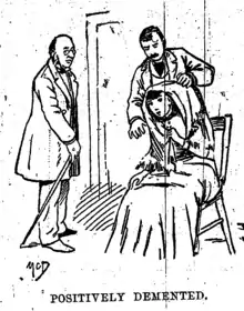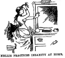 Several doctors then examined her; all declared her insane. "Positively demented," said one, "I consider it a hopeless case. She needs to be put where someone will take care of her."[4] The head of the insane pavilion at Bellevue Hospital pronounced her "undoubtedly insane". The case of the "pretty crazy girl" attracted media attention: "Who Is This Insane Girl?" asked the New York Sun. The New York Times wrote of the "mysterious waif" with the "wild, haunted look in her eyes" and her desperate cry: "I can't remember I can't remember."[5][6][7]