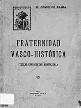 - ↑ 33 pages. Full title El vademécum del Vasco. La redención de Euskeria y las potencias del alma por un guerniqués originario. In the pamphlet Arana divided Basques into 6 groups, depending upon their vision of their own country: 1) nacionalistas radicales (seeking total independence), 2) tradicionalistas or legitimistas (with Carlist vision), 3) nacionalistas moderados (seeking restoration of pre-1839 status), 4) euskalerriacos (seeking restoration of pre-1876 status) and 5) cucos (seeking preservation of Concierto Economico regulations), Conde de Arana, La redención de Euskeria, Bilbao 1922, pp. 23-25