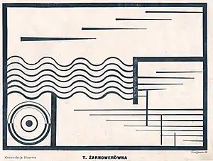 Szczuka and Żarnowerówna were co-creators of the "Grupa Kubistów, Konstruktywistów i Suprematystów Blok" (Cubists, Constructivists, and Suprematists group), the first Polish constructivist artistic group in Warsaw.[5] Żarnowerówna co-edited the group's magazine, Blok, Czasopismo Awangardy Artystycznej (Blok, The Magazine of Artistic Avant-garde), as well as Szczuka's magazine, Dźwignia (The Lever), from his death until July 1928. Both magazines serve as the primary source of information about her work as most of her original works are lost. Blok disbanded in 1926 due to artistic differences amongst its members. After Szczuka's death in 1927, Żarnowerówna completed many of his works, including the cover for Anatol Stern's (1899–1968) poem Europa in 1929.